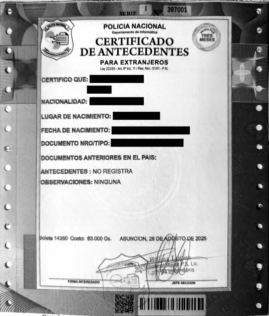 | Paraguayan Criminal Certificate | 68,000 PYG | Step 4 | Valid for 3 months (~15 USD) |